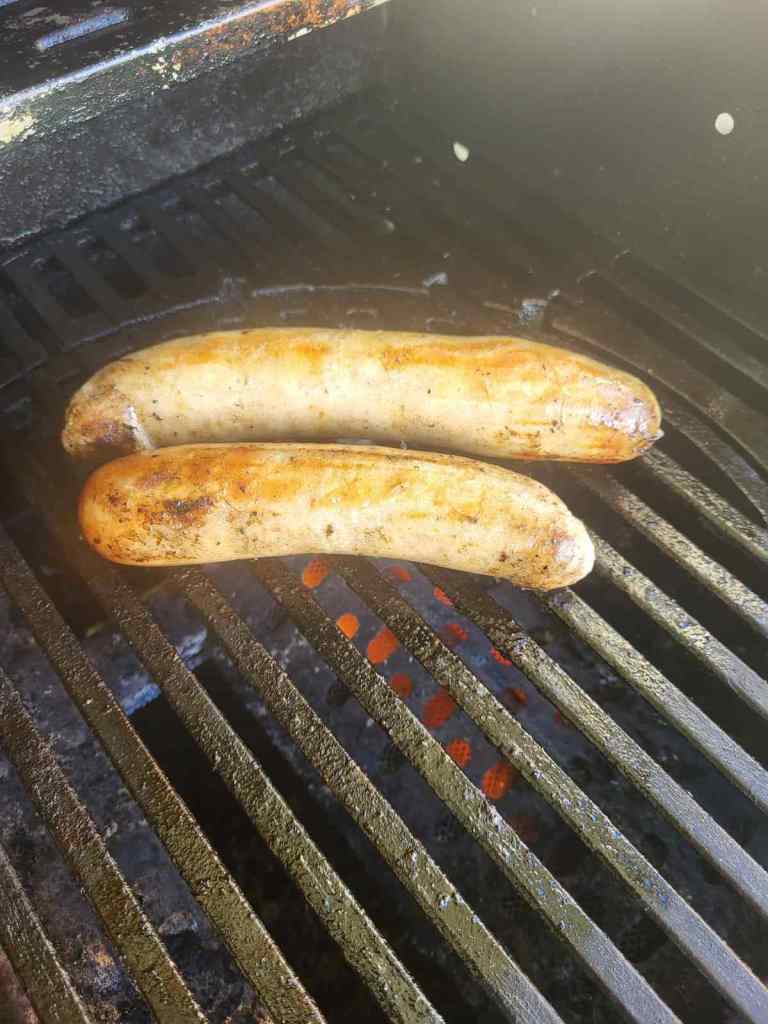 Eine Rostbratwurst (von gestern) auf dem Grill (den Rest habe ich eingefroren)