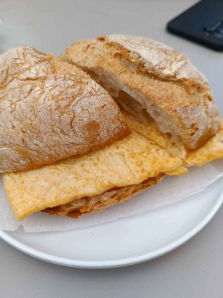 Ich musste auf die Fähre etwas warten, gab’s ein Rühreibrötchen