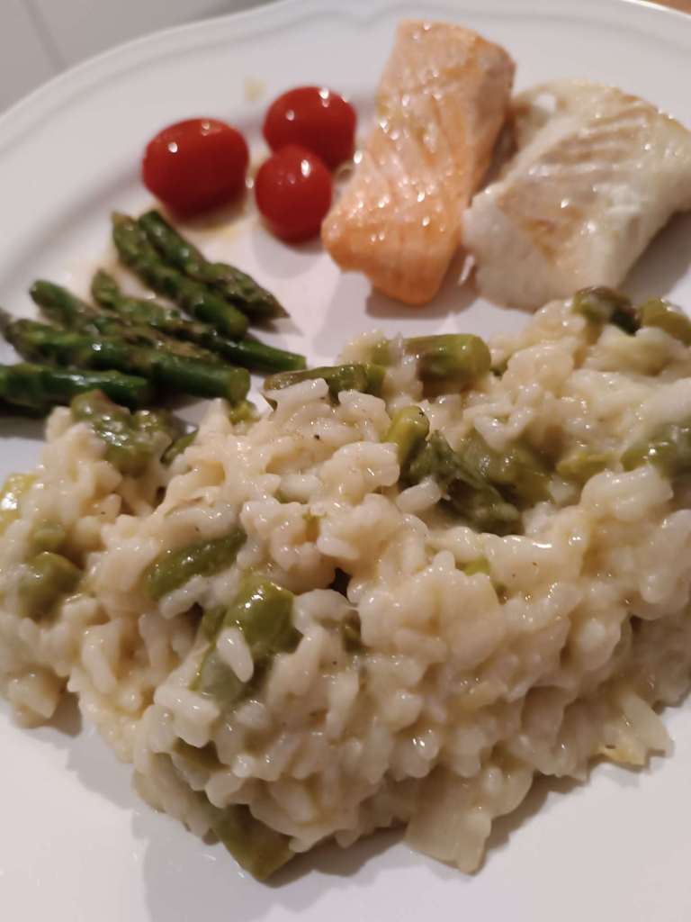 Spargelrisotto und zweierlei Fisch (Lachs und Dorsch)