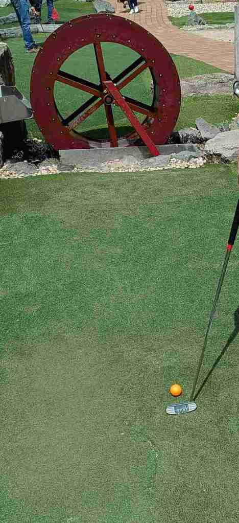 Hier musste man durch das sich drehende Wasserrad treffen.