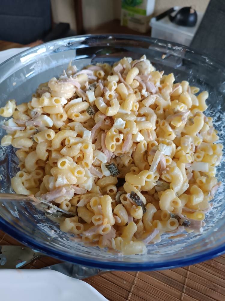 Gegrillt, dazu Nudelsalat, Zucchini, Mais