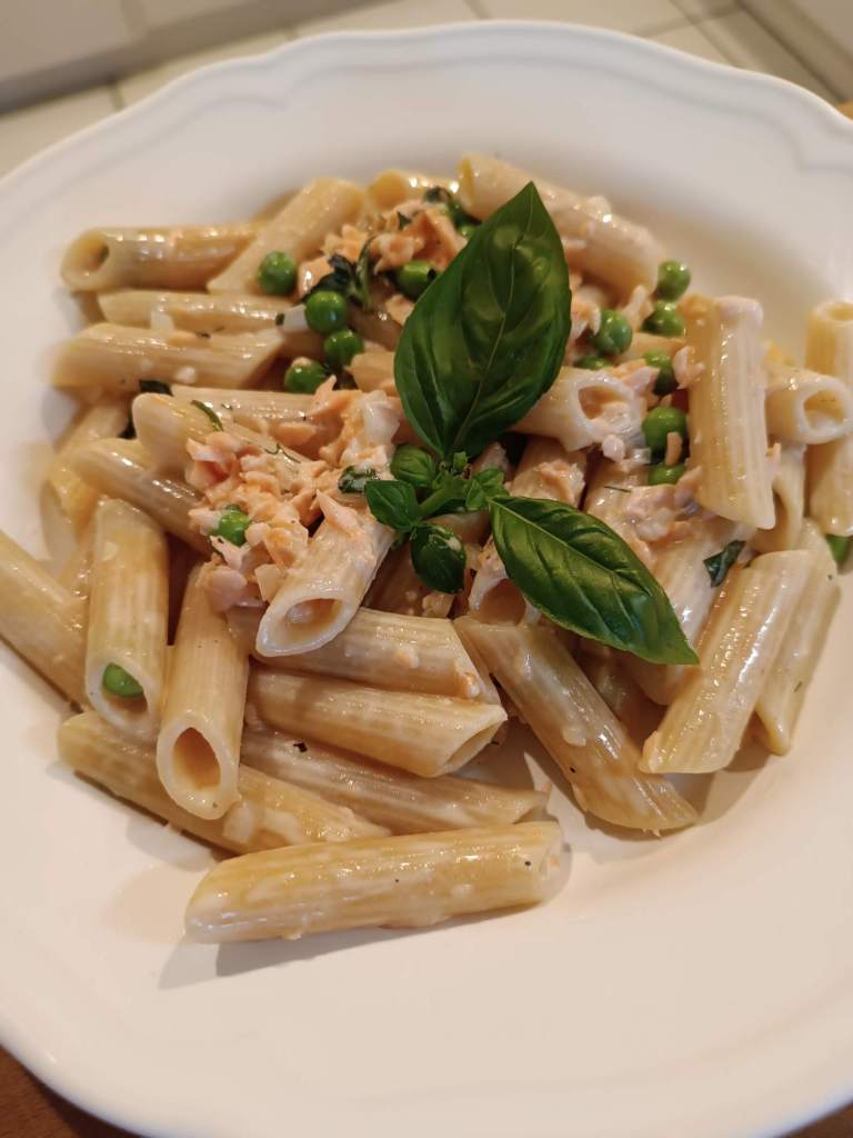 Abends Penne mit Räucherlachs-Erbsen-Sahne Sauce