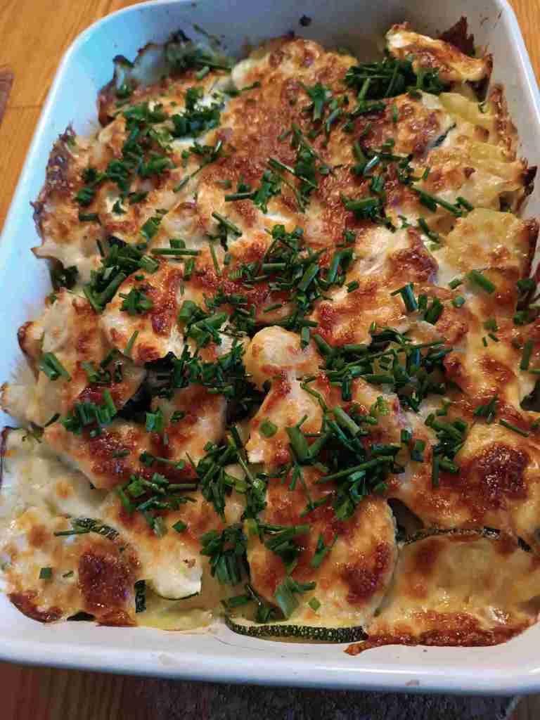 Selbstgemachtes Aioli (nur Öl, Milch und Knoblauch Granulat), Zucchini Kartoffel Auflauf