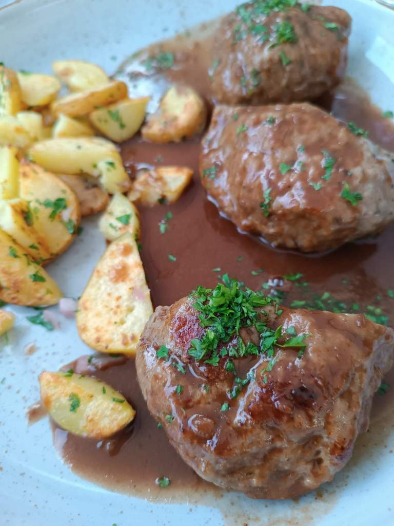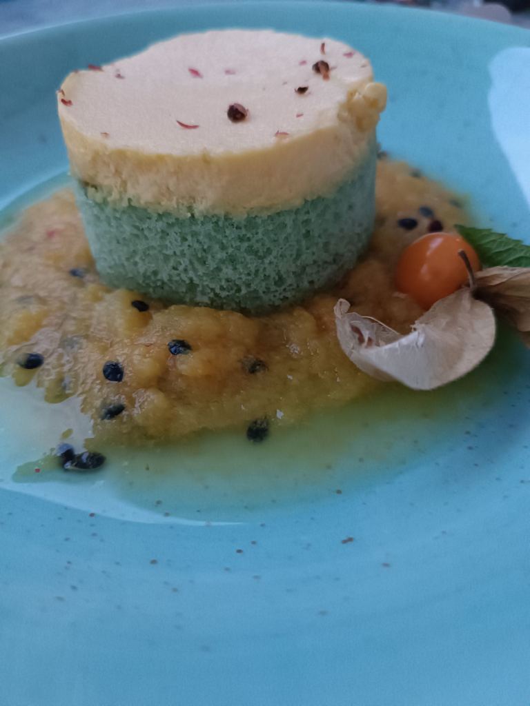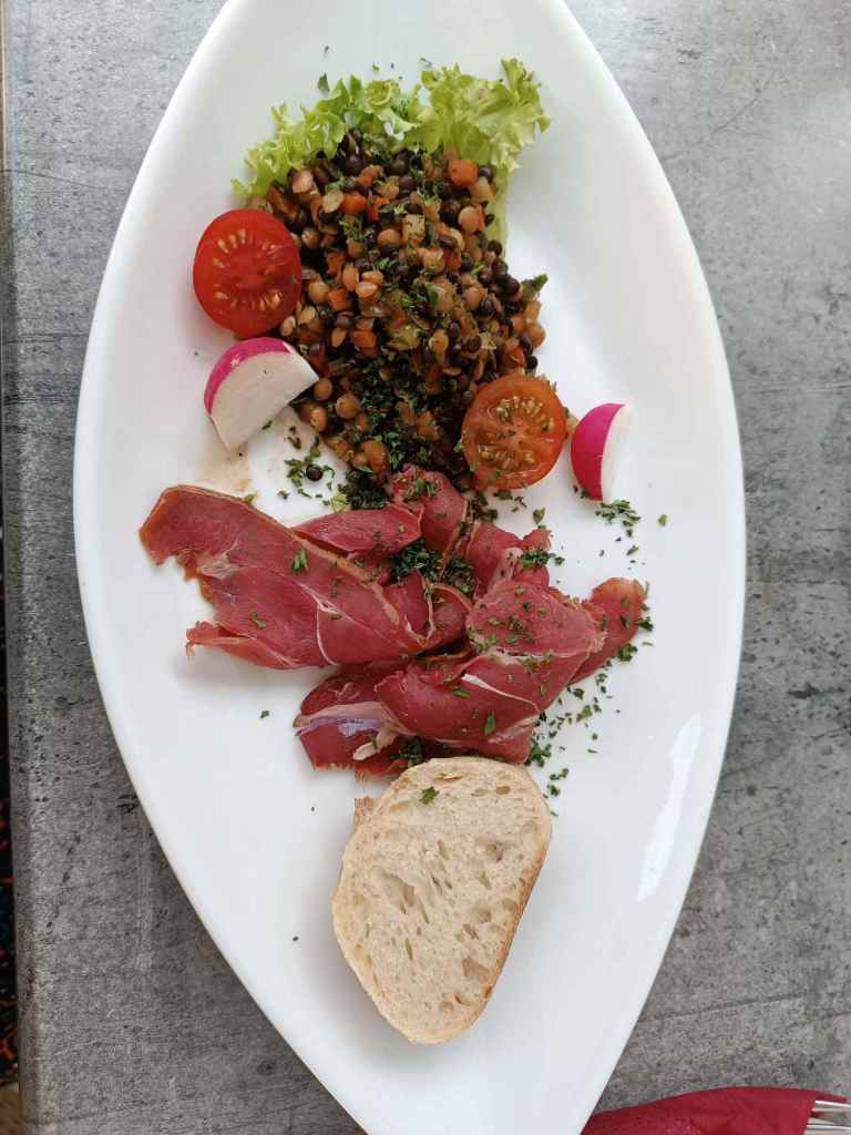 Abends Wildschweinschinken mit Linsensalat, Salat, Wildschweinfrikadellen, zweierlei von der Passionsfrucht