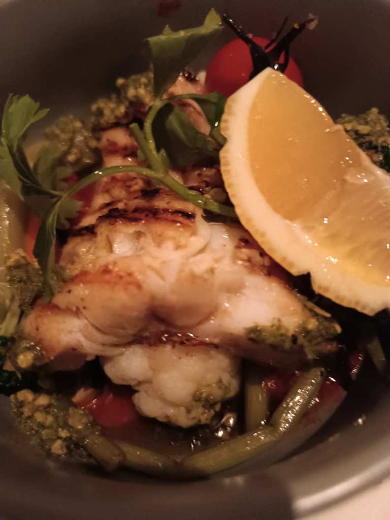 Sie haben mich zum Essen eingeladen als Dankeschön fürs Haushüten (win-winwin Situation würde ich sagen) – Brot mit Kräuterbutter und geriebener Tomate und Chimichurri), Vitello tonnato, Zander