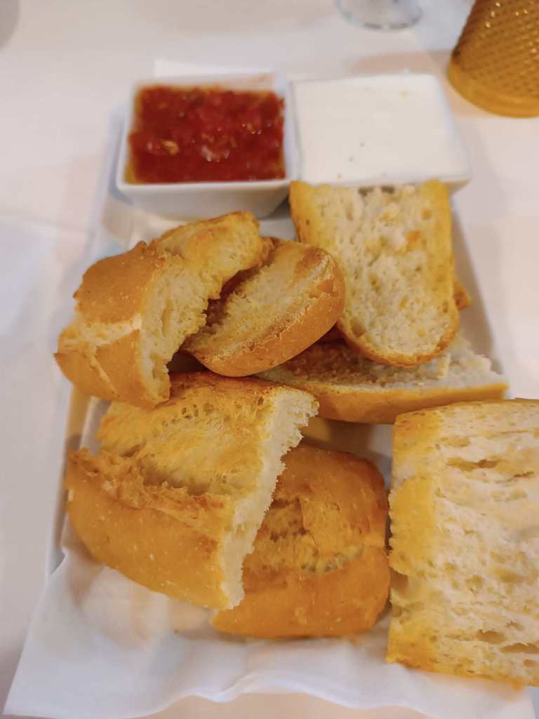 Als Vorspeise neben Tomaten, Aioli, Brot – mit Garnelen und Kartoffeln gefüllte Paprika mit einer Sauce aus Portwein, Bechamelsauce und speziellen Krebsen, außerdem Choppitos in einer Sauce aus kleinen Bohnen – sehr lecker