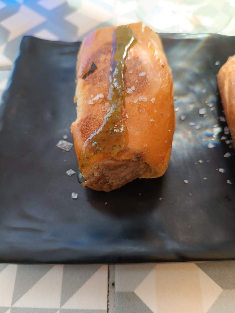– Brioche mit einer Füllung aus Wurstfarce, obendrauf ein süsses Pesto