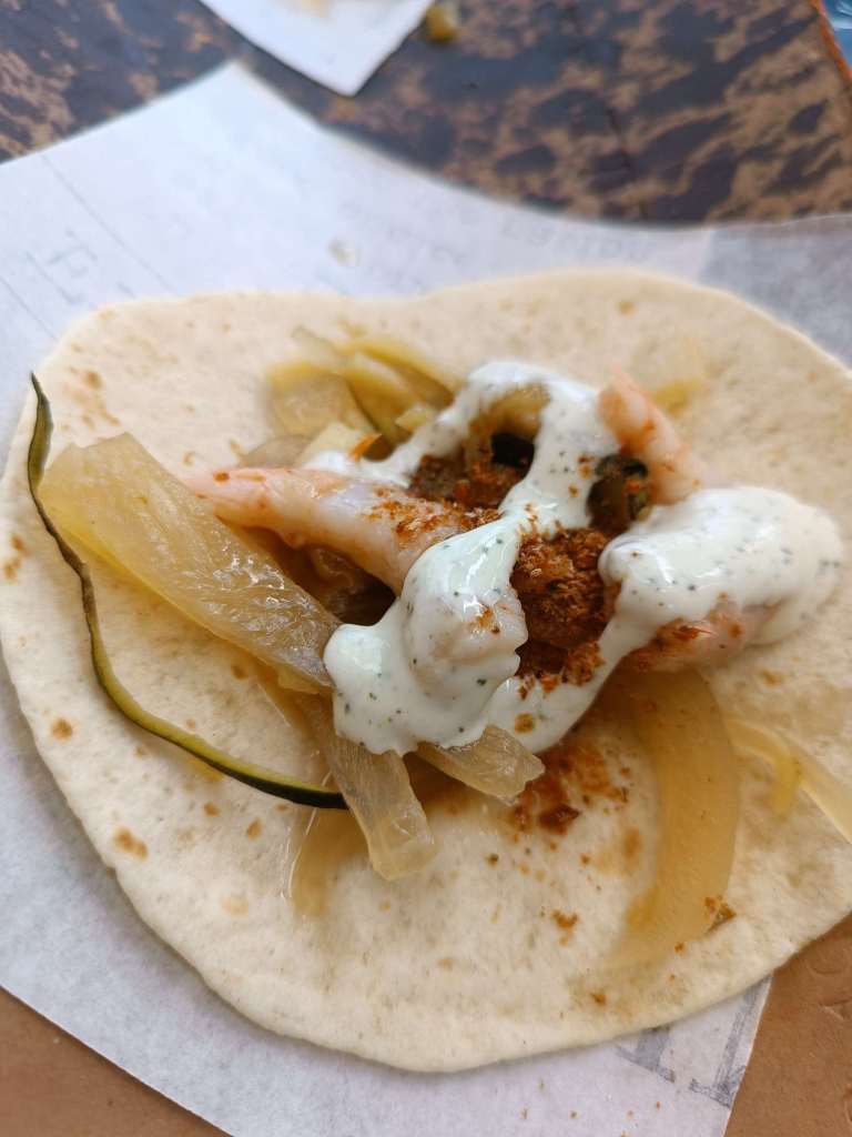 – Tortilla mit Garnelen und Joghurtsauce. Da war auch irgendwie Kümmel dabei. Aber lecker.