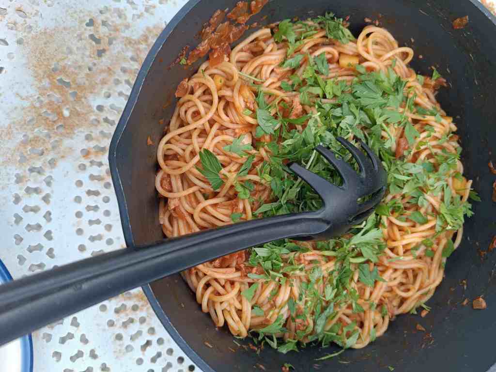 Spaghetti mit Resten: Passata, Zwiebeln, Knoblauch, Zucchini, Thunfisch, Petersilie