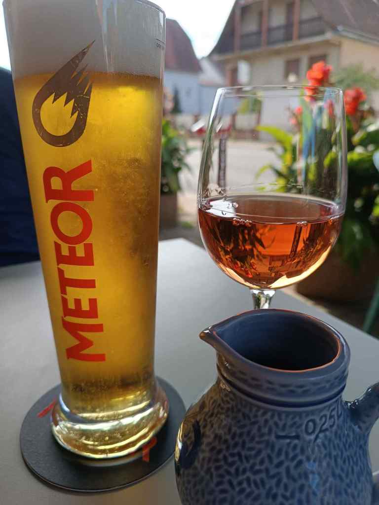 Kaffee und Cremant zum Frühstück. Im Ort, neben dem „zuen“ Laden gibt es ein Bistro, Rosé und Bier, das Bistro ist direkt an einer Straße, gegenüber steht ein hübsches Haus