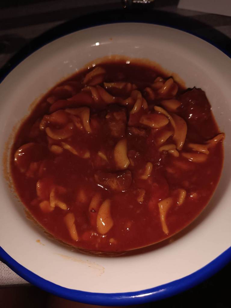 Also gab es – Gulasch mit Nudeln aus der Dose, Baguette von gestern und Käse