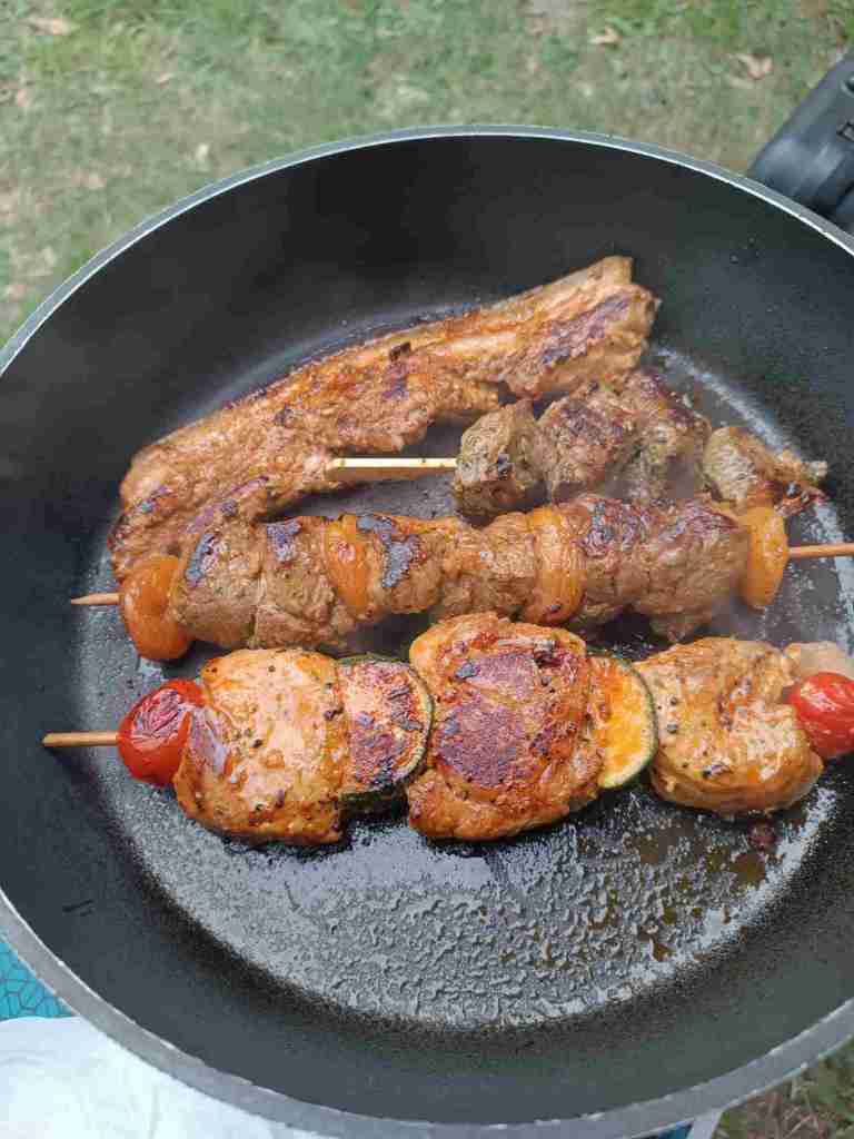Fleischspieße, Bauchspeck, Würstchen – dazu Tomatensalat und Baguette