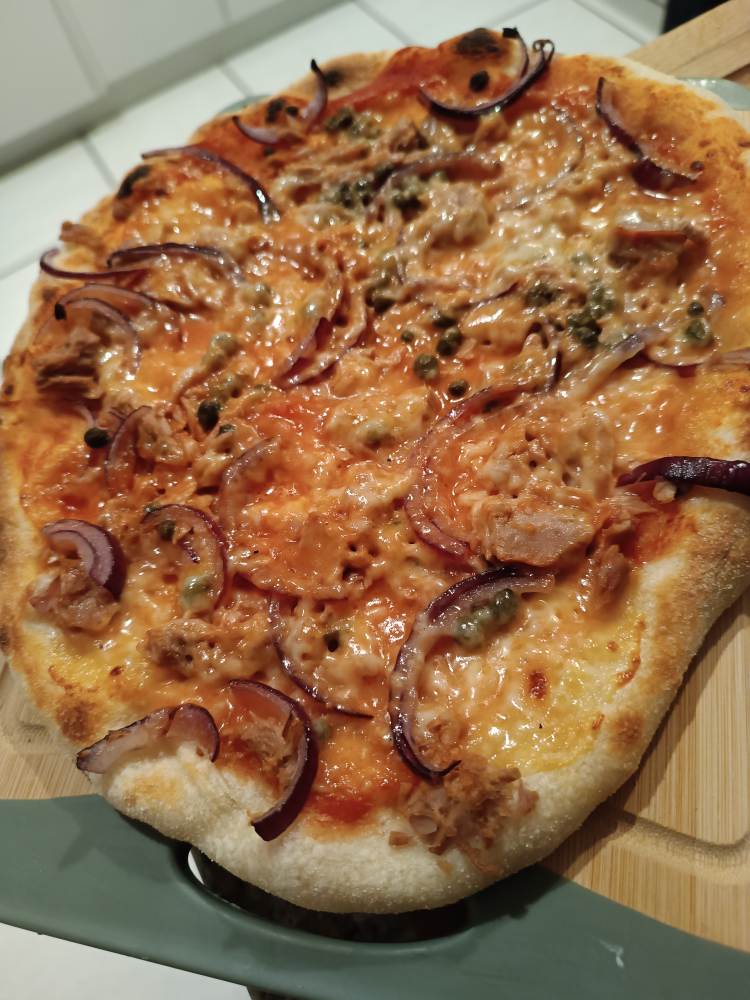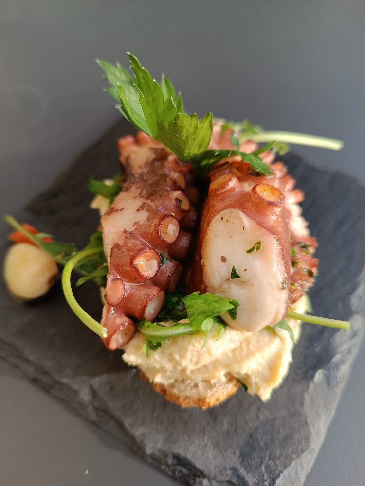 In der Tapas Bar – Pulpo auf einem Humusbaguette, abends selbstgemachte Pizza (Thunfisch, Kapern, Zwiebeln)