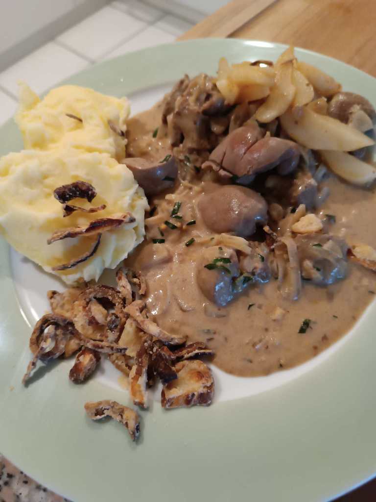 Kalbsnieren mit Birnen und Zwiebeln und Kartoffelbrei