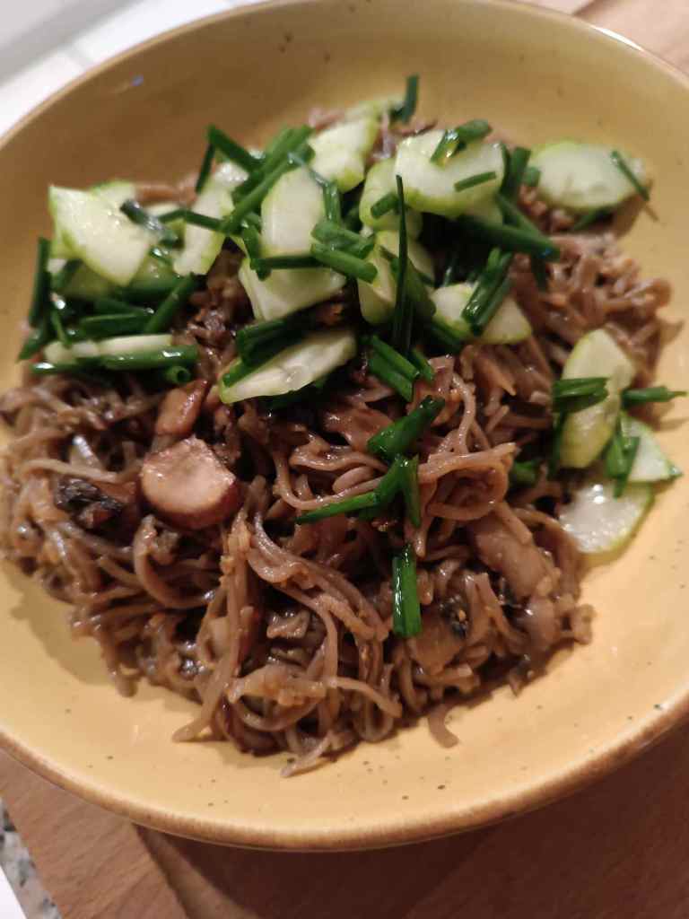 Gebratene Sobanudeln mit Pilzen, Ingwer und Ei