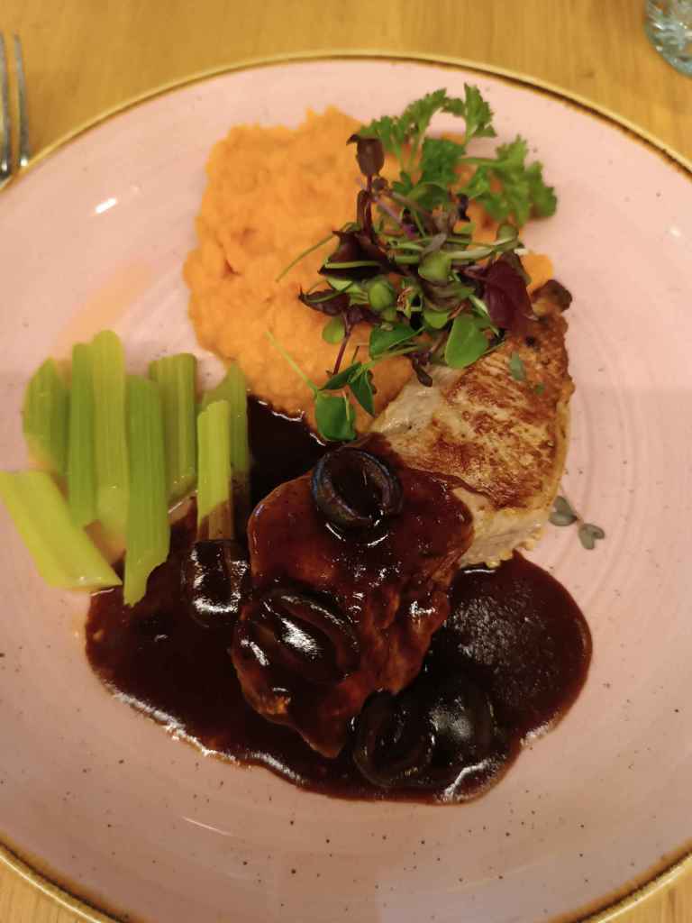 Gefülltes Schweinssteak, Tomaten-Frischkäsefüllung, Olivenjus, Süsskartoffelstock, grüner Sellerie. Vorher Salat