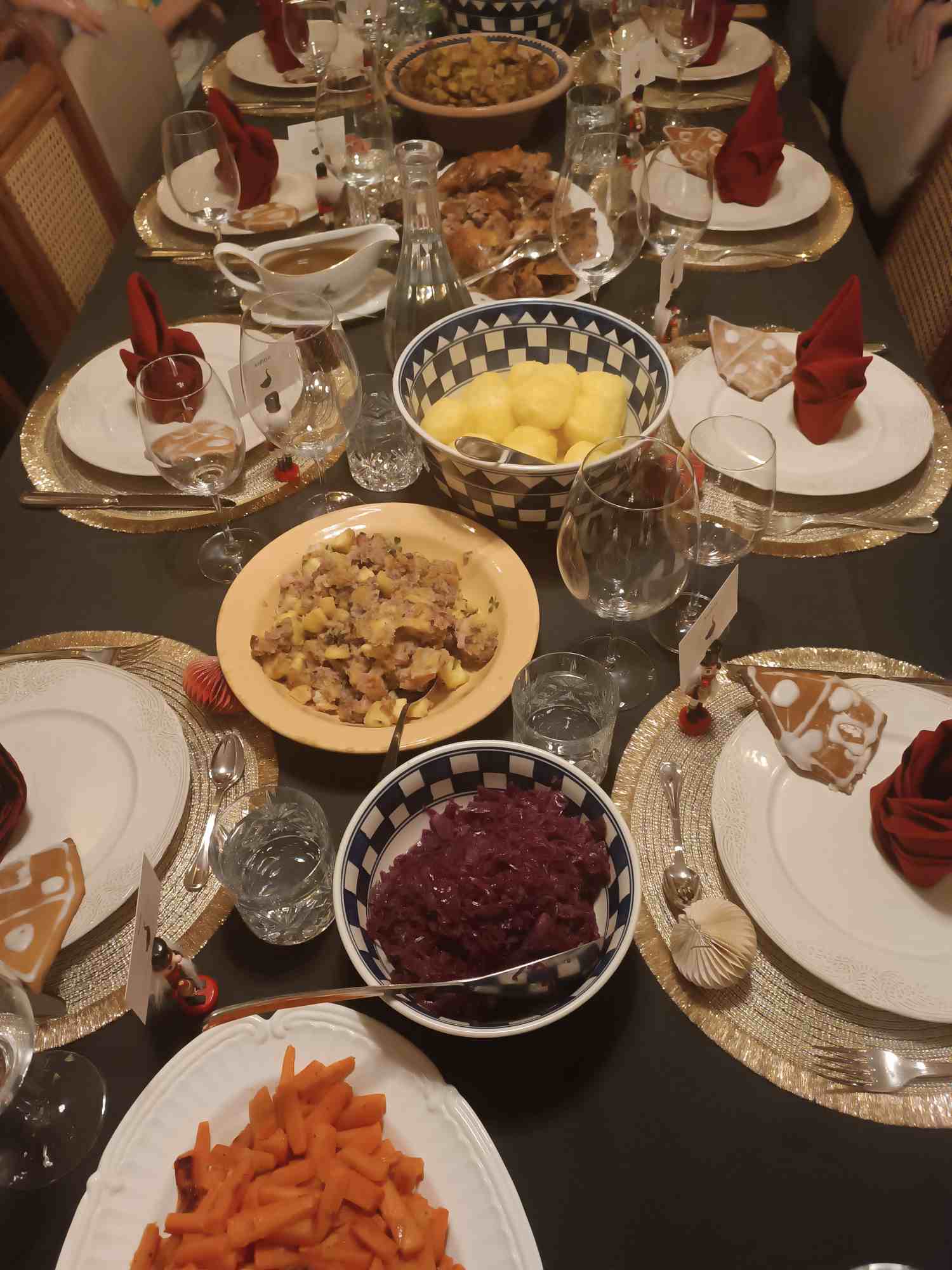 Überraschung: Gans. Dazu Kartoffelknödel, Semmelknödel, Rotkraut, Rosenkohl, Möhren