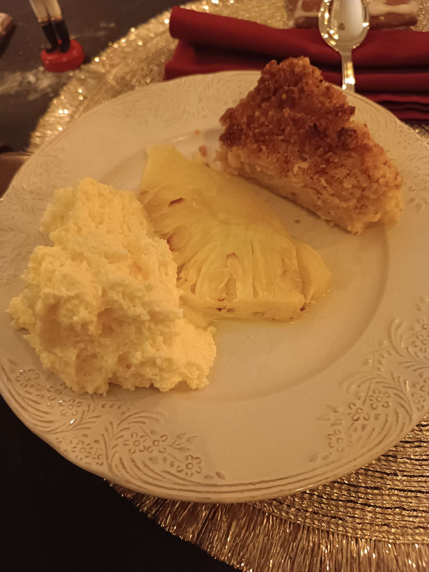 Als Dessert gebratene Ananas, Zitronencreme, Apfelkuchen mit Ingwer
