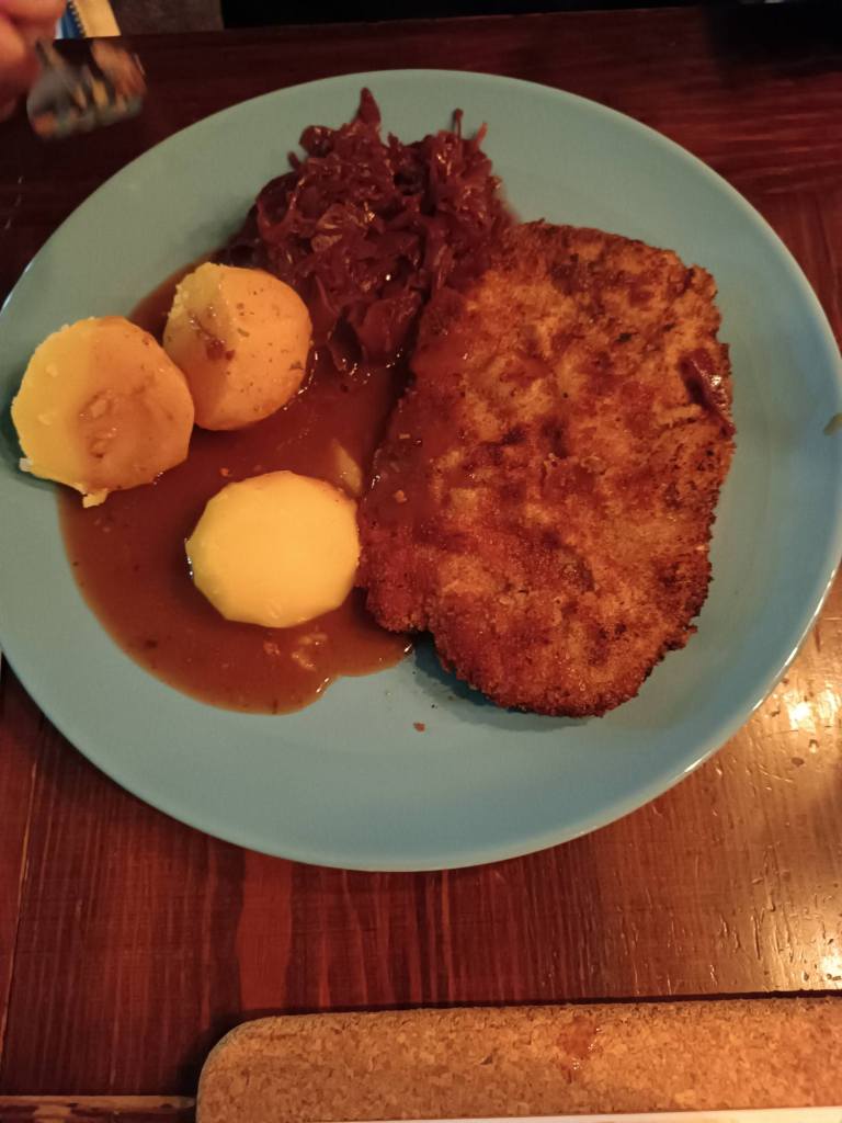 Panierte Schnitzel und Schweinekamm, Kartoffeln, Rotkraut