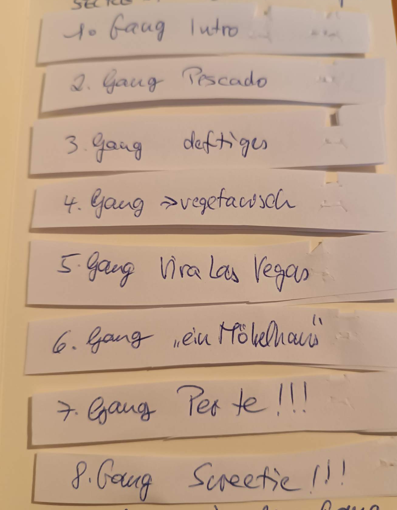Mein Lieblings Mitbewohner hat gekocht – 8 Speisen, Thema Klopse, es gab eine Karte und vor jedem Gang durfte ich dann gucken, was es ist