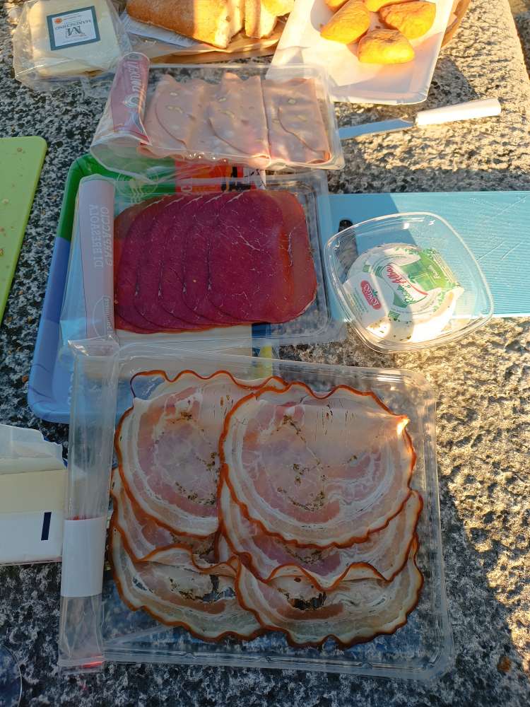 Morgens Joghurt auf dem Balkon vom Hotel Zimmer. Abends diverse Leckereien aus dem Supermarkt vor dem Bus