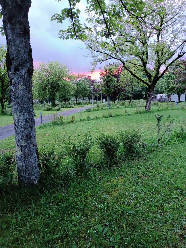 Nach dem Rundgang im Dorf weiter Richtung Lapalisse, Sainte Gerand le Puy, Moulins, Bourbon-Lancy, Pougues les Eau – hier ist ein kleiner Campingplatz. Außer mir noch 4 Arbeiter, die im Zelt wohnen und halt tagsüber irgendwo arbeiten. Sehr nette Typen. Die Frauen Toilette/Waschraum war abgeschlossen, der Typ vom Service sagte dann, ich wäre halt die erste Frau auf dem Platz 😂. Jedenfalls habe ich das alles für mich alleine. Und das Abendrot