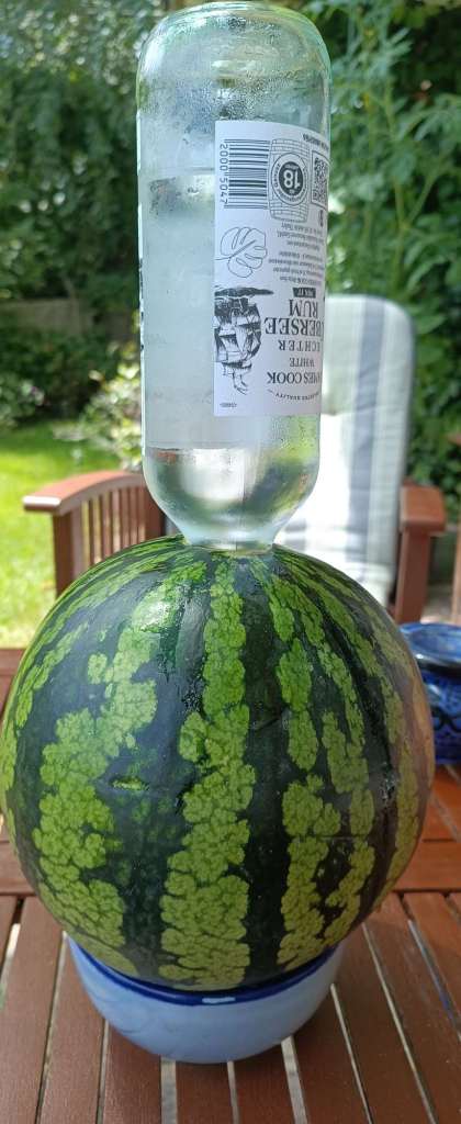 Mittags schaue ich mal, was Mitbewohner und Besuch machen, bereite einen Nudelsalat vor (später soll gegrillt werden) und rauche 2 Zigaretten bei einem Kaffee, draussen, in der Sonne. Den Leuten gehts gut, ich kann beruhigt ins Arbeitszimmer zurück. Wobei – Die Besucher inkl. Mitbewohner haben nur Dummheiten im Kopf. Sie stecken eine Flasche Rum in eine Melone und schwören mir, dass das sehr lecker sein wird. Ich werde es morgen sehen, das Ganze muss für eine Nacht in den Kühlschrank (ohne Flasche dann)