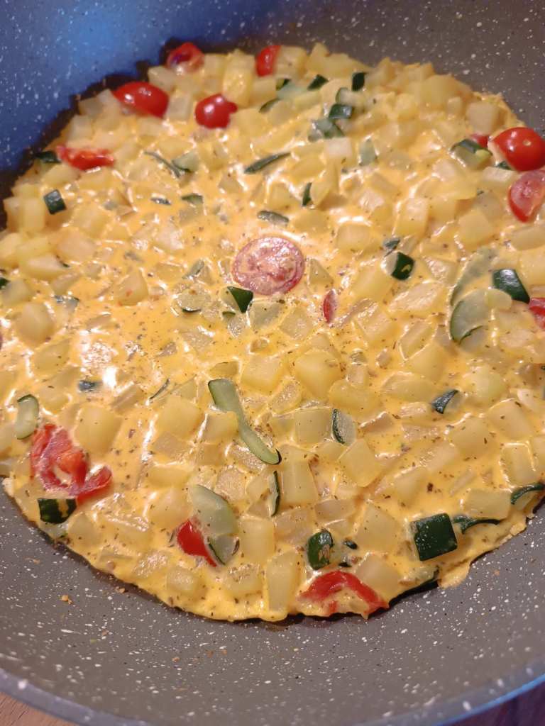 Abends griechische Tortilla. Hab ich erfunden – einfach wie normale Tortilla, aber zusätzlich mit Zucchini, Tomaten, griechischer Joghurt und Gyrosgewürz