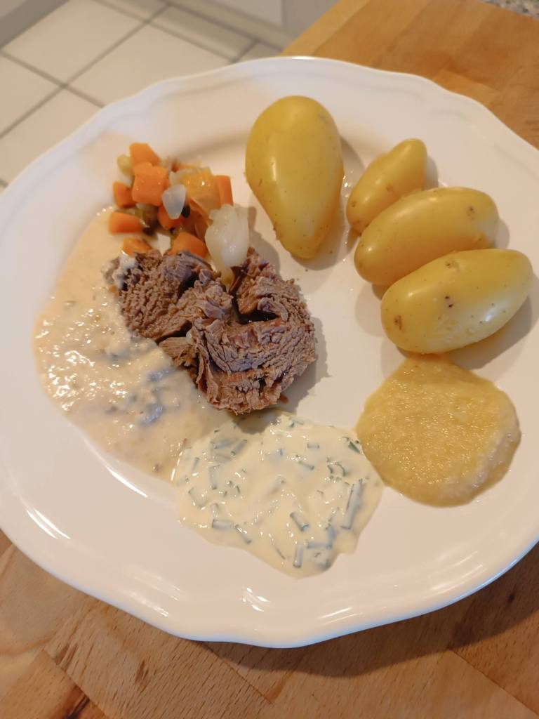 Ich hatte Apfelmus mit Meerrettich gemischt, das war lecker und die Schnittlauchsauce fand ich toll. Die eigentliche Meerrettich Sauce ging so. Heute versuche ich nochmal eine andere Sauce.
