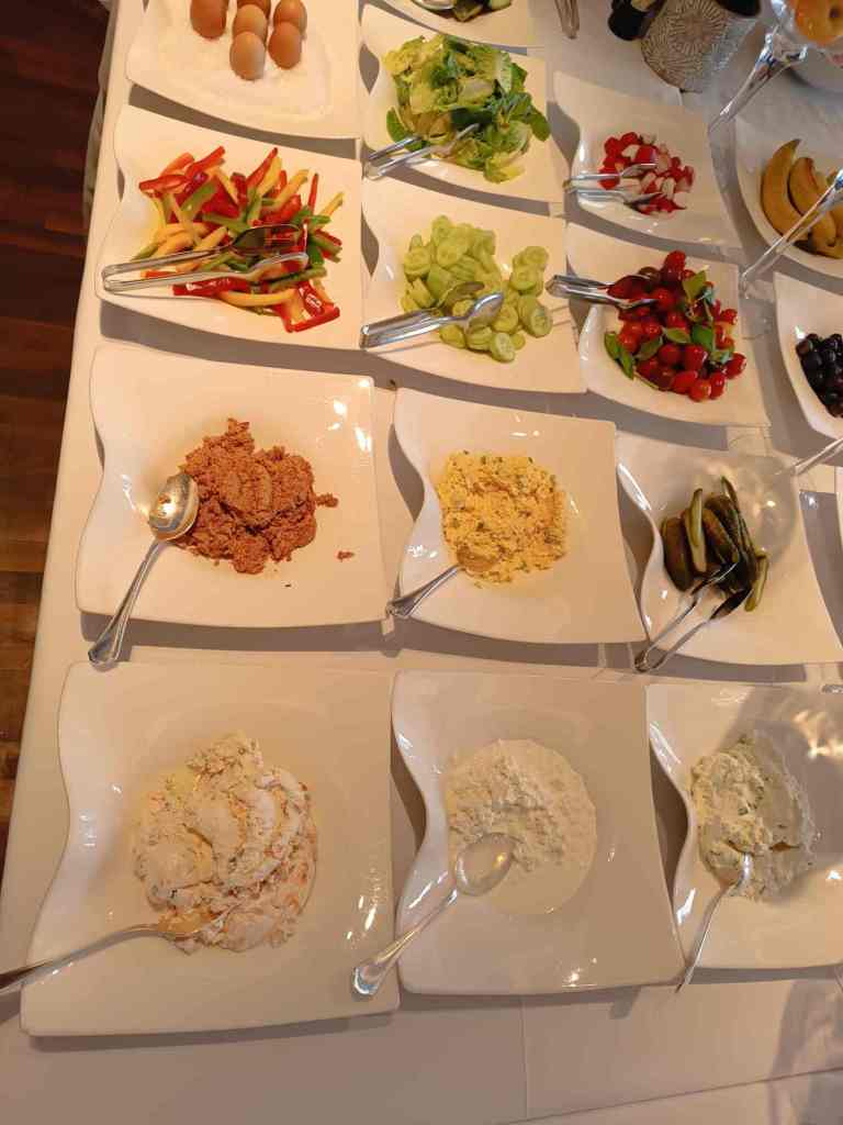 Frühstück im Hotel. Rührei, Lachs, diverse Cremes, witzige Honigstation – ein Traum