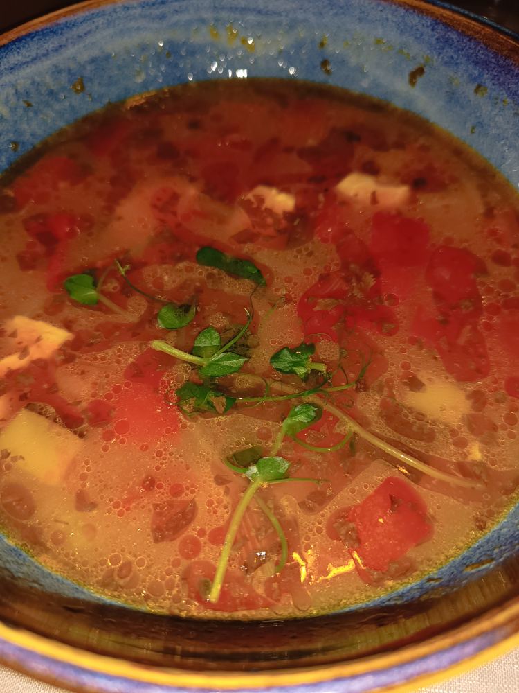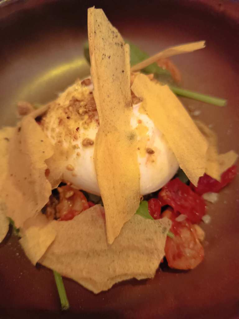 Abends: Burrata, Fischsuppe, Zander auf Bulgur, Käsekuchen