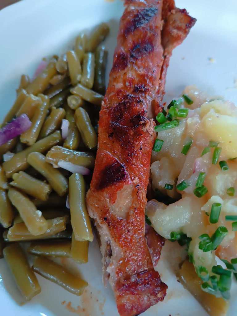 Fleischfackel, Bohnensalat, Kartoffelsalat