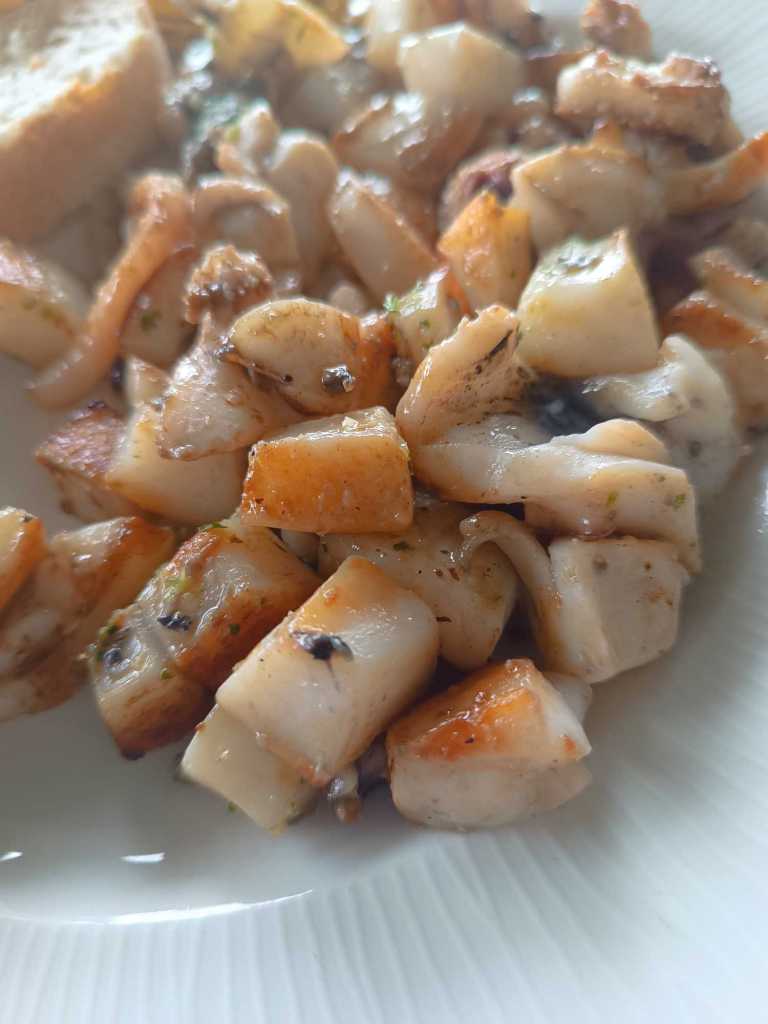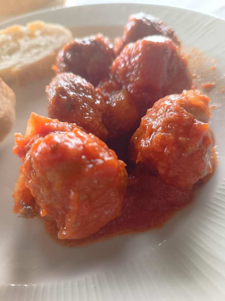Tapas in einer Arbeiterkneipe fußläufig entfernt – im Uhrzeigersinn: ensaladilla russa, Albondigas, Sepia