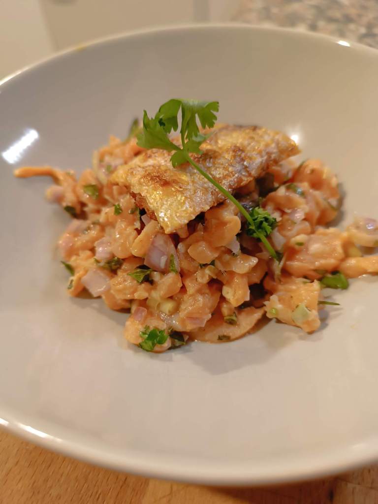Thailändisch: Laarb Dip Salmon – ich würde mal sagen, eine Art Lachs Cevice. Ich hab noch die Lachshaut knusprig gebraten und drüber gelegt. War ganz ok – also alles zusammen