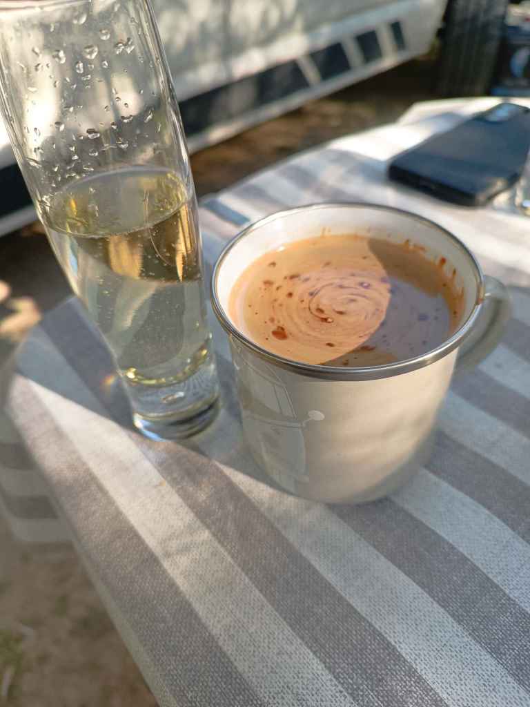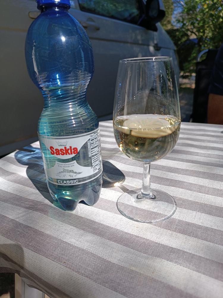 Ich gehe abwaschen und dusche. Dann suche ich mir ein sonniges Plätzchen, der Campingplatz ist nicht voll. Es gibt einen Muskat (ich habe gestern neben Flaschen auch einen Karton gekauft, eine Wasserflasche abgefüllt und in den Kühlschrank gestellt, ich Fuchs. Ist praktisch und die Leute auf dem Platz merken nicht, dass ich dem daytrinking fröhne)