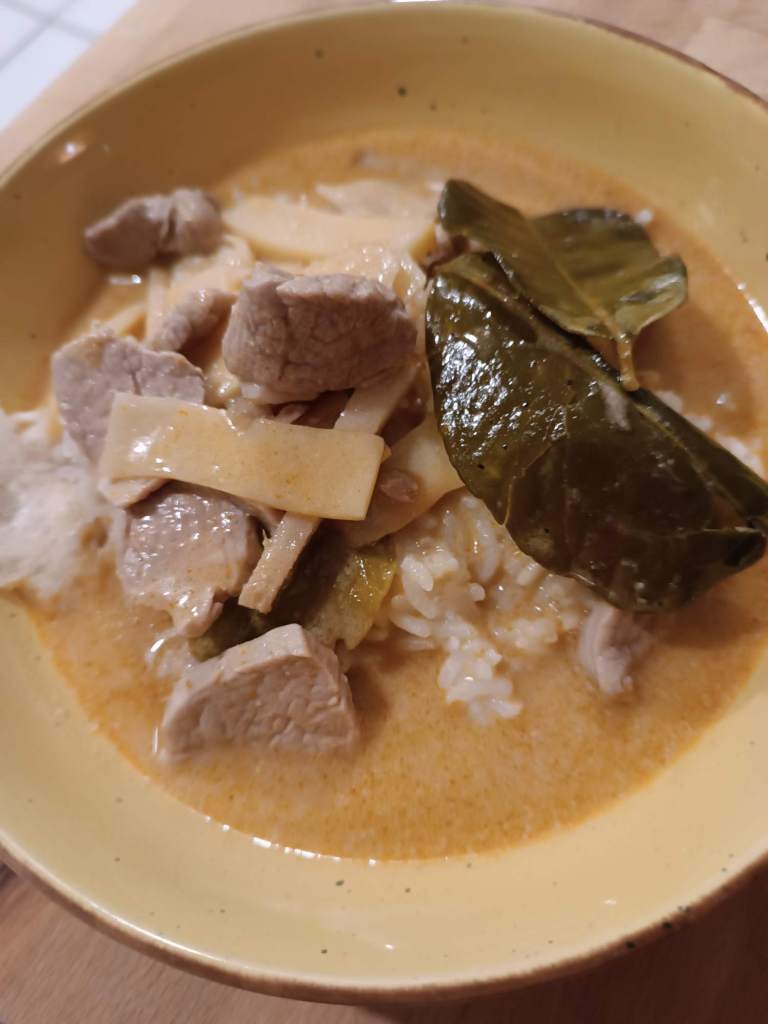 Abends: Gaeng Phed Moo Nor Mai (rotes Curry mit Schweinefleisch und Bambus)