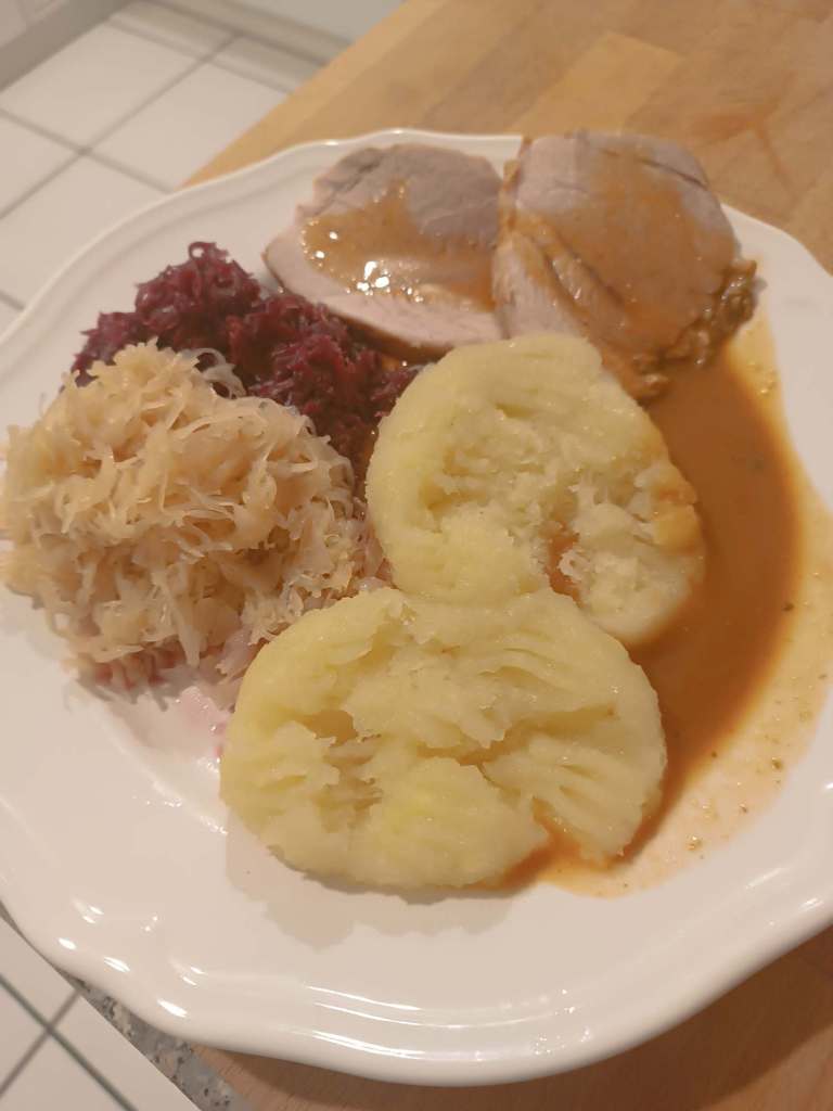 Schweinebraten, rohe Klöße, Sauerkraut, Rotkohl
