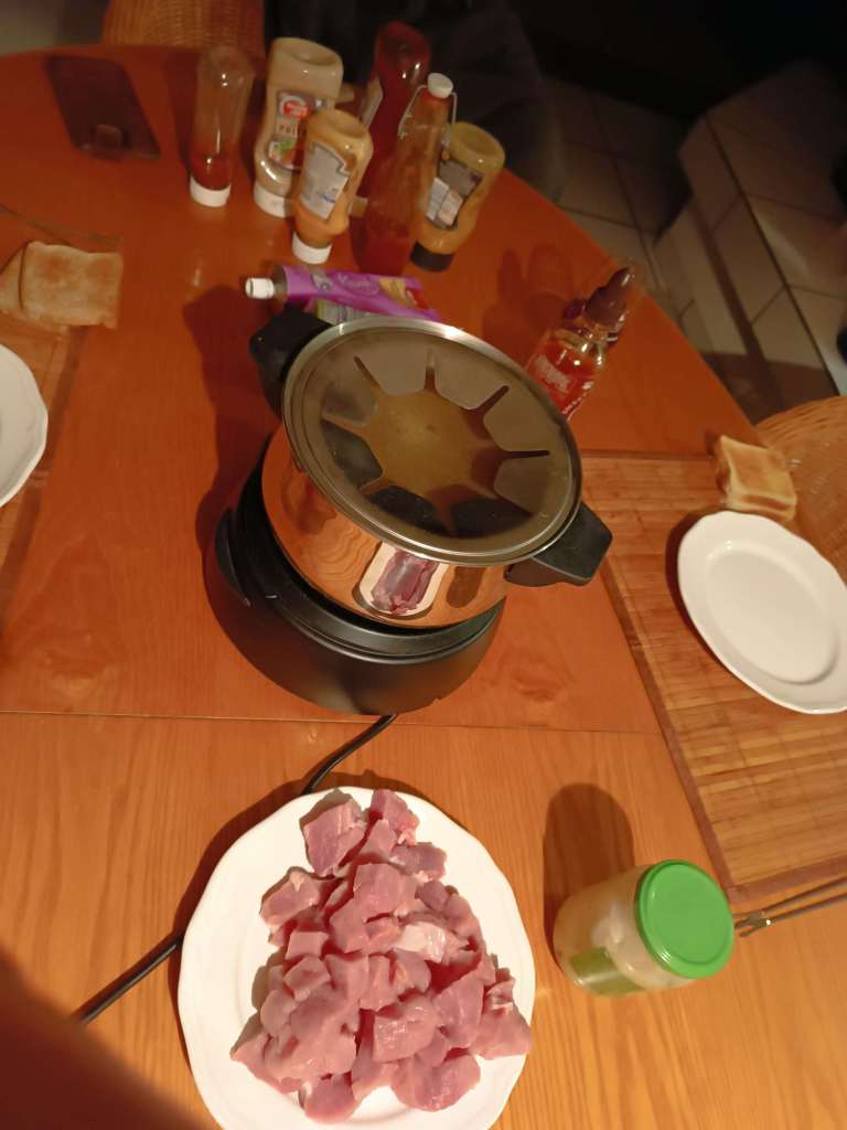 Im Supermarkt gab es Schweinsbäggli im Angebot. Habe ich gekauft, weil ich dachte, das wäre das Schweizer Wort für Schweinsbäckchen. War es dann nicht 😢. Lt. Internet geht Fondue (oder Geschnetzeltes) – gab es also Fondue. Gehen gleich mal die Grillsaucen weg