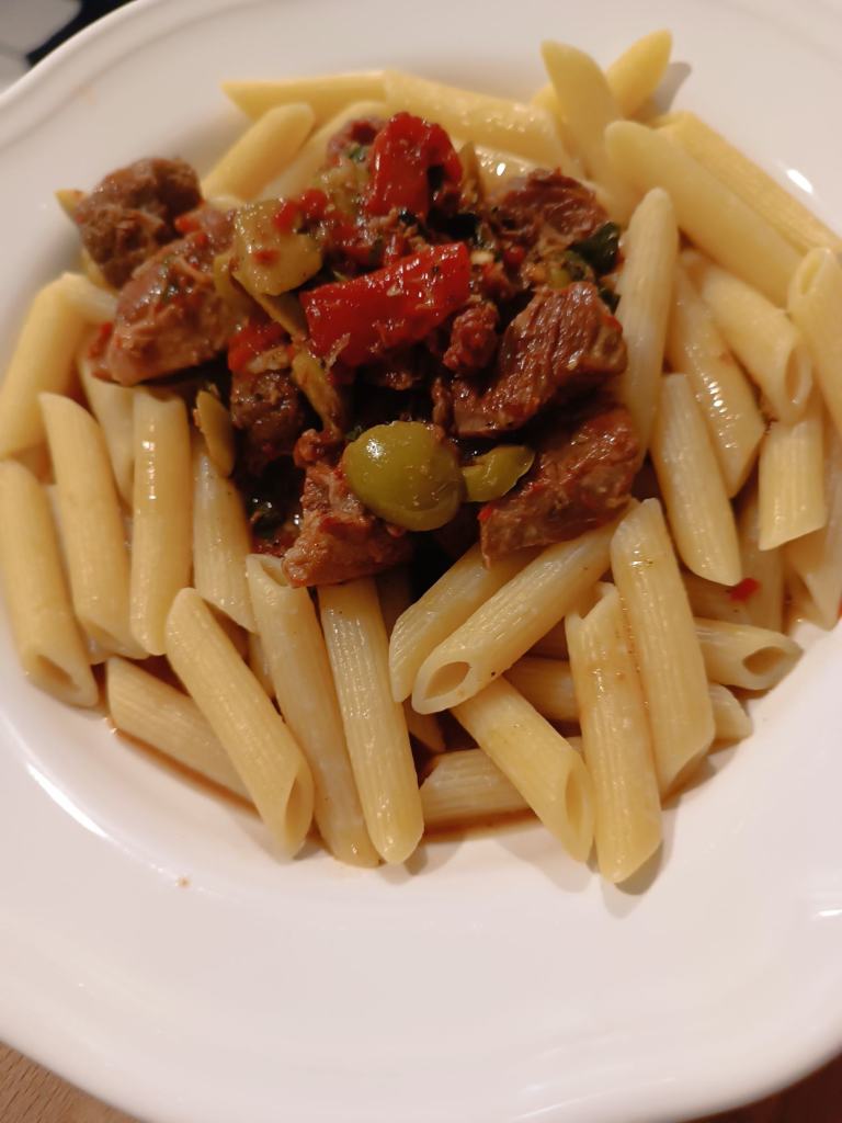 Lammgulasch mit Zitrone, gerösteten Paprika und Oliven, dazu Pasta