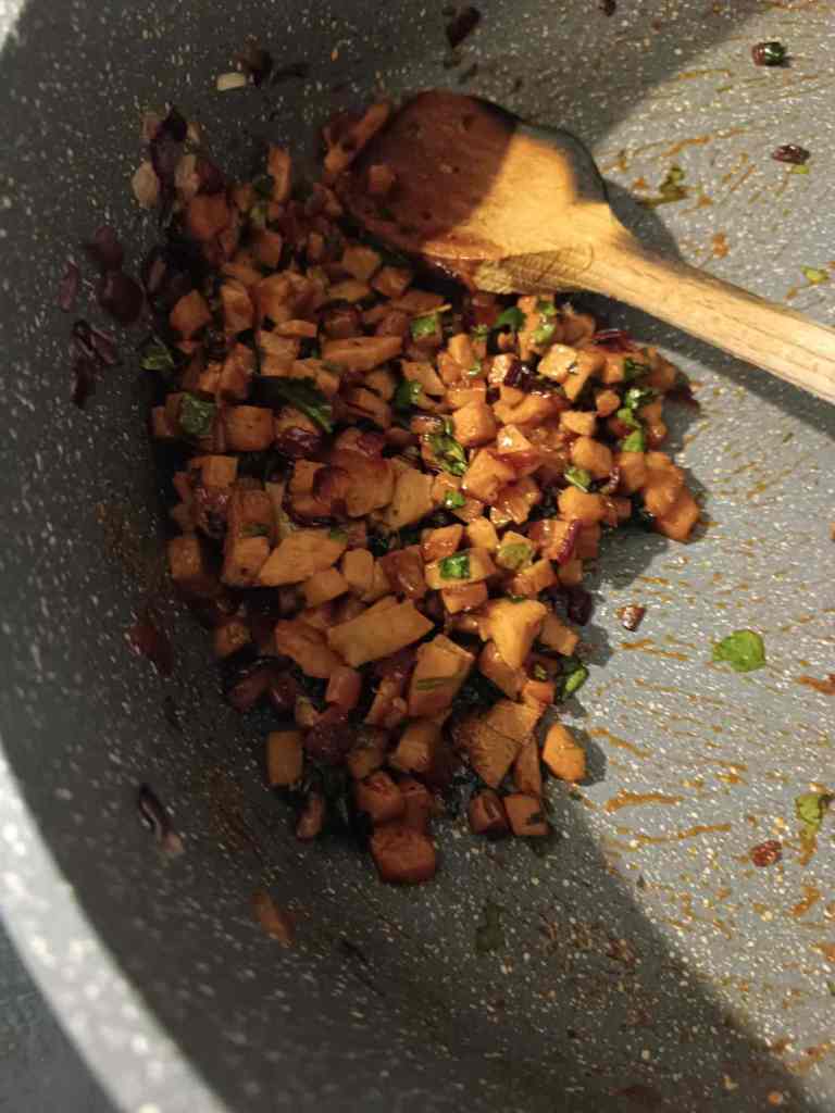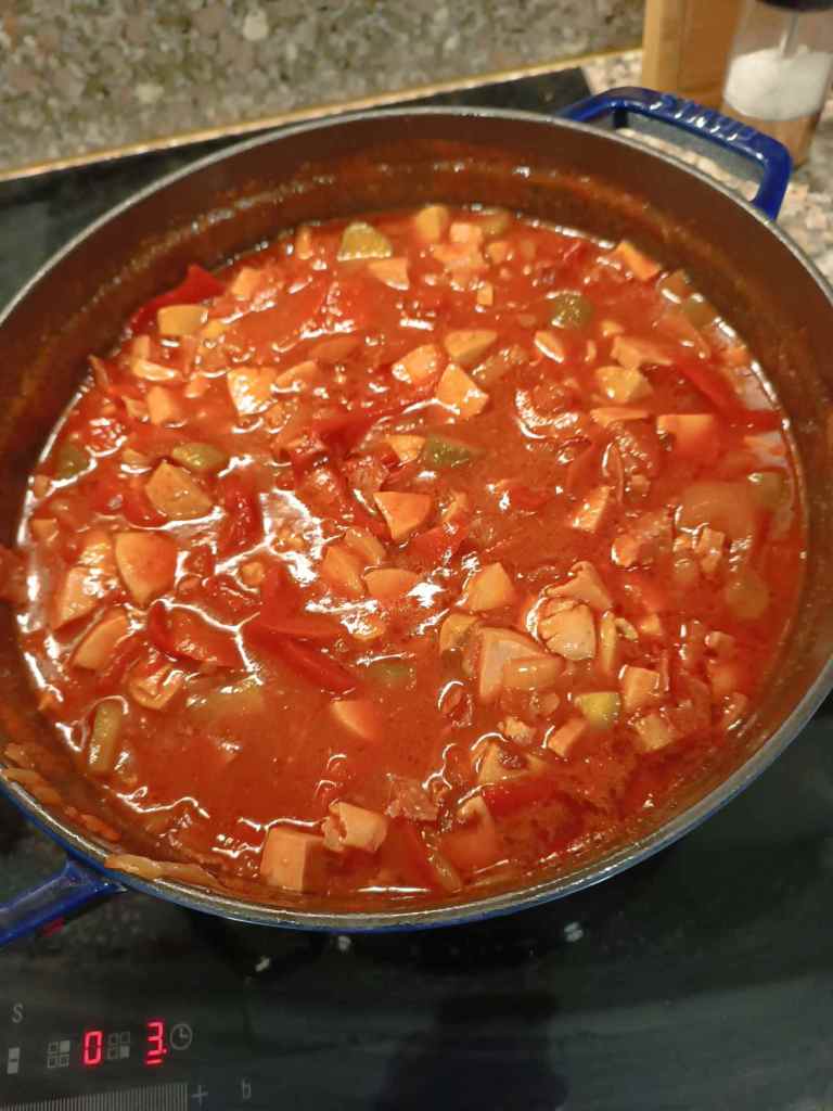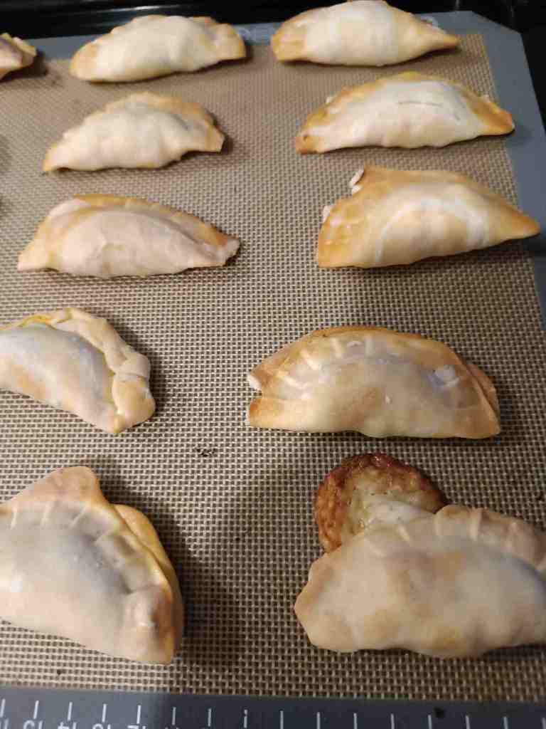 Diesmal Teig selber gemacht, irgendwelches Zeug zu einer Füllung verarbeitet (klein geschnittene gebratene Bratwurst, Zwiebel, Rest Koriander, etwas Thai Sauce) und nochmal ein paar Teilchen gemacht. Danach noch Flan mit Kokosnussmilch und Ananassauce