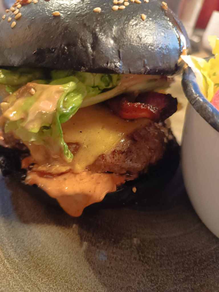 Mittags mit 3 Kolleginnen Burger mit schwarzem Brötchen essen gewesen