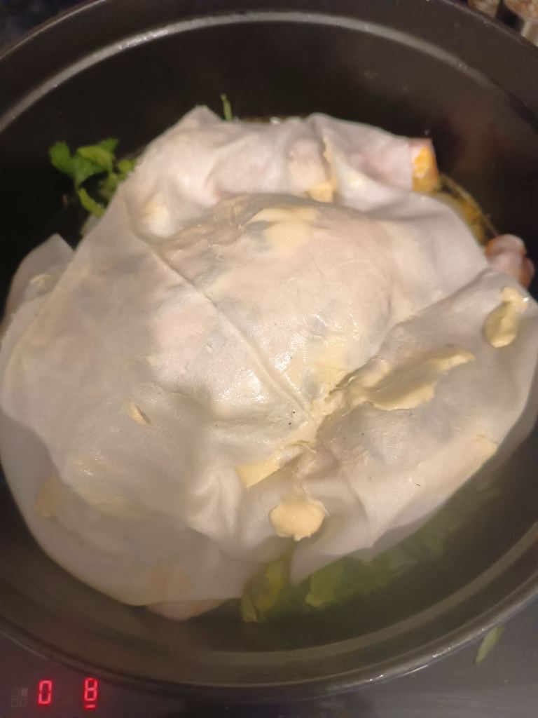 Einen Cremant zum Aufstehen (der Kreislauf will auch angekurbelt werden), Weißburgunder (an das Huhn kam auch Weisswein 😉)