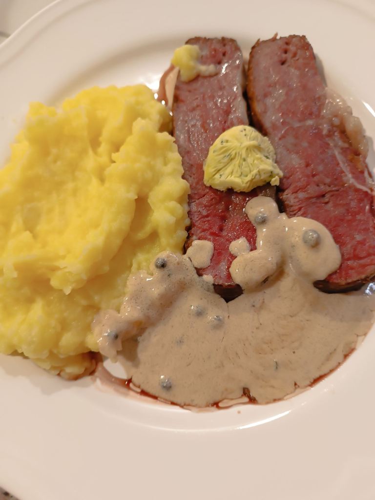 Entrecote mit Kartoffel Kohlrabi Stampf und grüne Pfeffersauce.