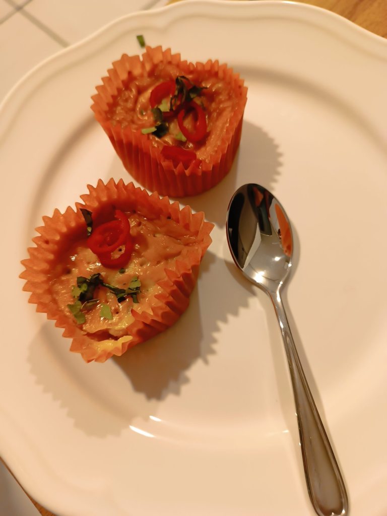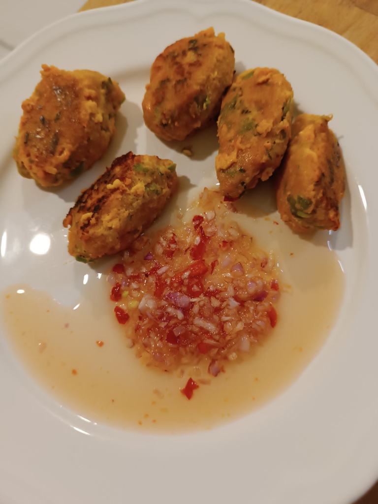 Zwei Vorspeisen: Hor Mok Muffins – teils mit Fisch, teils mit Garnelen. Da nehme ich das nächste Mal keine Papierförmchen, sondern so Silikon Teile. Tod Man Pla – Fischküchlein mit grünen Bohnen und Gemüsesauce