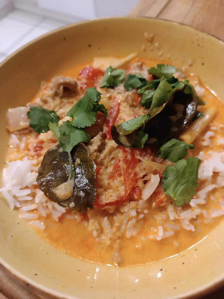 Zu Hause hocke ich mich erstmal hin und begutachte den Pensionskassenbescheid (eine Art Betriebsrente, jedes Jahr kommt ein Wisch mit der Info, wieviel man dann dereinst bekommen wird). Nachdem ich den gelesen habe, hole ich Prosecco und trinke darauf. Dann geht’s ans kochen, es gibt rotes Curry mit Schweinefleisch und Kokosmilch. Sehr lecker, leicht scharf. Dazu habe ich Reis gegessen.