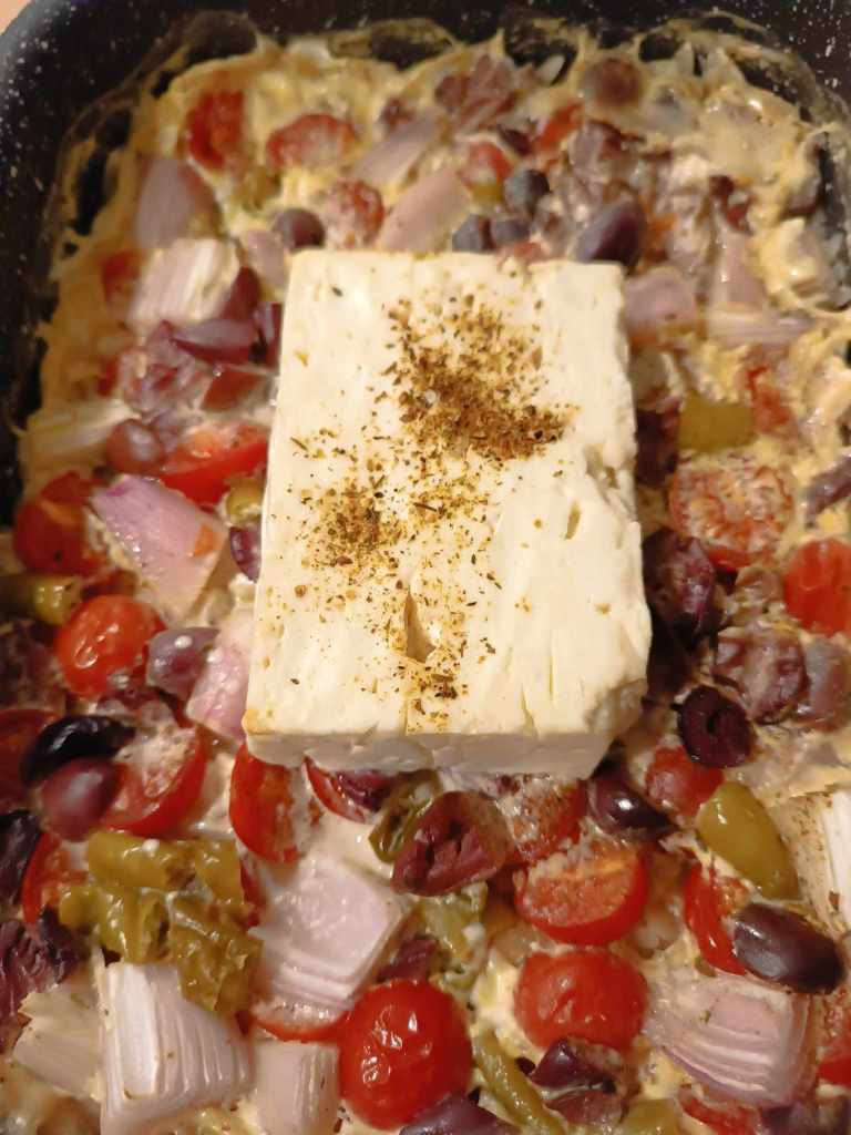 Abends Auflauf aus griechischen Nudeln, Feta Käse, Tomaten, Zwiebeln, Peperoni, Oliven, Sahne, Gyrosgewürz