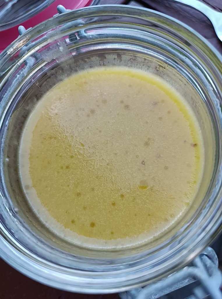 Dazu gibt es Salat mit Senf Honig Vinaigrette (1000e Kalorien, aber hey, man lebt und schlemmt nur einmal)