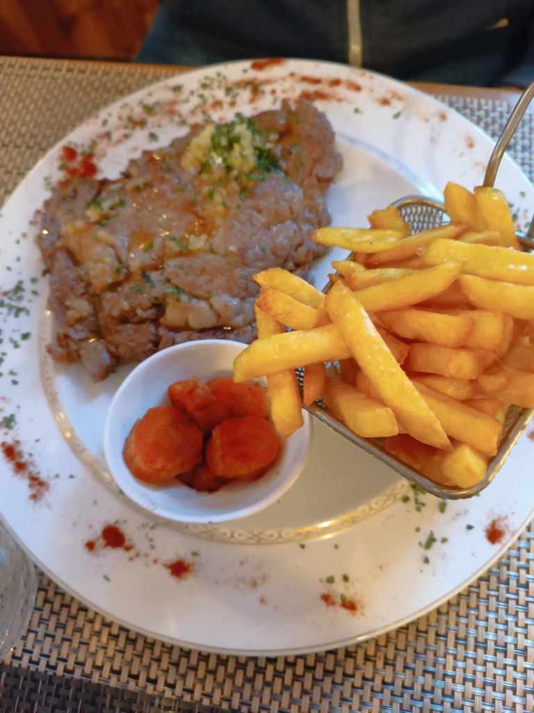 Ich hatte Schnecken und Kalbsnieren, das Geburtstagskind Flammkuchen und Entrecote. Zum Nachtisch Café Gourmand.