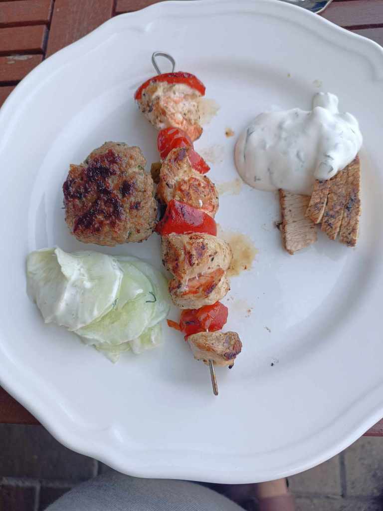 Heute war nochmal schönes Wetter, also würde gegrillt: Putengyros (selbst gemacht), Hähnchen Garnelen Spieße (selbst gemacht), eigentlich waren noch Bärlauch Würste geplant (selbst gewurstet) – allerdings war der Darm verschwunden, gab es halt Bärlauch Bulletten