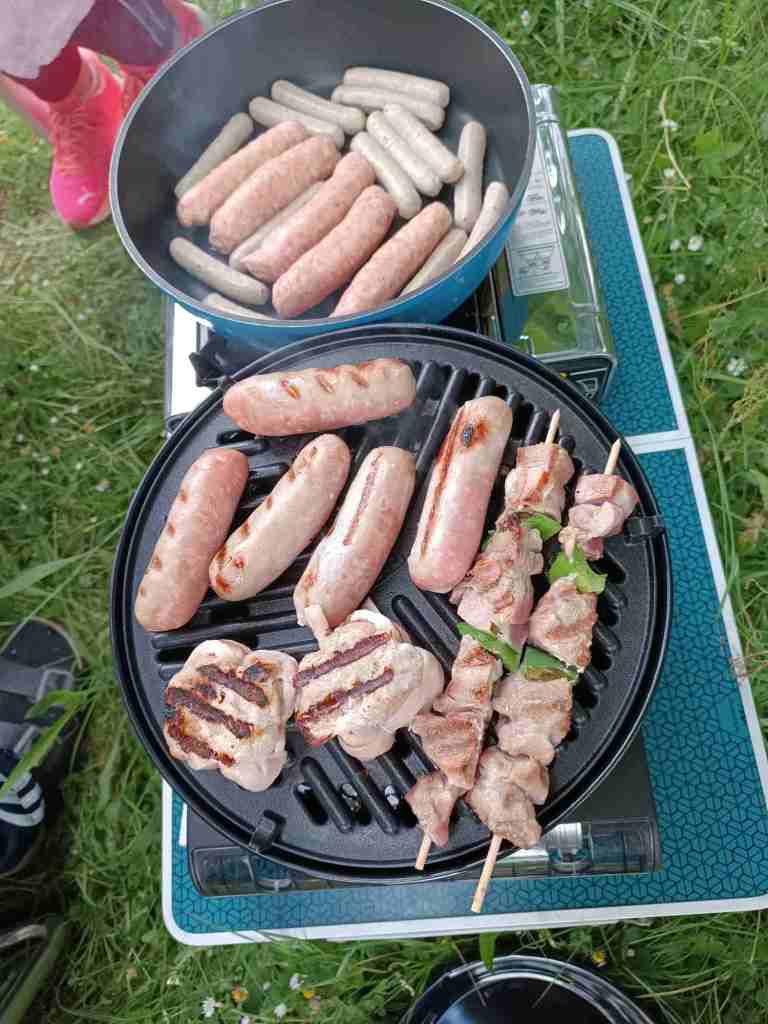 Gegrillt -verschiedene Würste, Schaschlik, so Fleischpäckchen mit Speck ummantelt